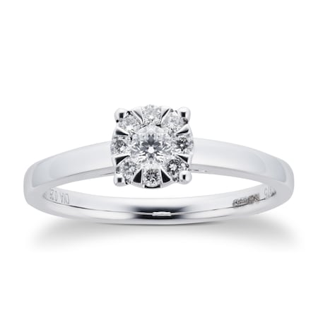 A cluster diamond with 0.25 carat total weight sits centrally on an 9ct white gold band.
