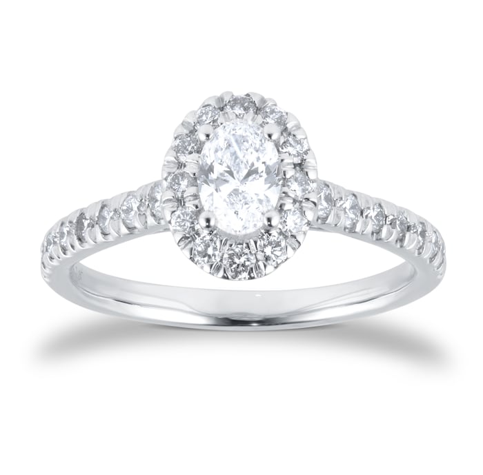 Her eye will be captivated by the breath-taking oval cut diamond, set amongst a glittering halo of smaller brilliant cut diamonds totalling 0.80ct.