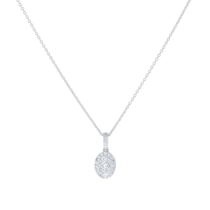 Crafted from 9ct white gold, this beautiful pendant necklace presents a glistening cluster of oval cut diamonds in a halo setting with 0.20ct total carat weight, suspended from a delicate 45cm chain.