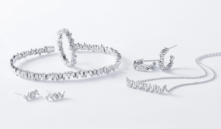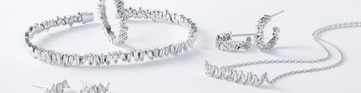 Inlay is a continuation of Suzanne’s Fireworks collection with an exciting twist; signature baguette-cut and princess-cut stones are randomly paved, protected with a gold bezel and secured by thin prongs for a contemporary feel.